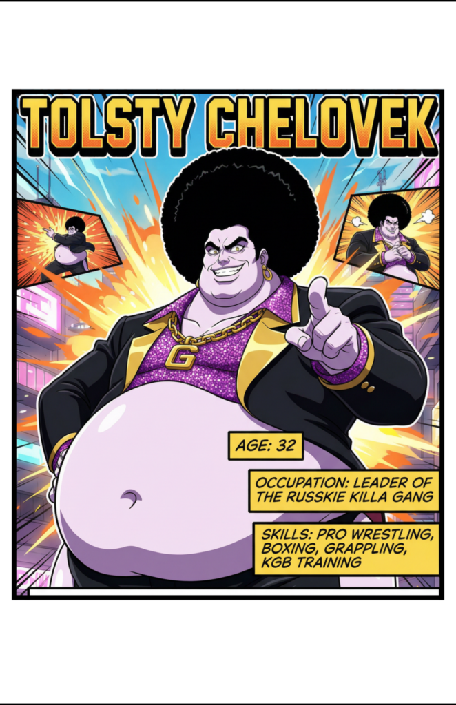 As leader of the Russkie Killa Gang, Tolsty Chelovek is both enforcer and strategist. He maintains order through strength, fear, and unwavering authority, ensuring loyalty within his ranks and dominance over rivals. His leadership style is direct and unforgiving, making him a central figure in the criminal power structure and a formidable force in any confrontation.