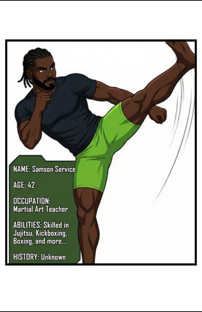 Samson Service is a seasoned martial arts instructor whose presence commands respect without demand. Calm, deliberate, and exacting, he teaches not just technique, but control, awareness, and restraint. Though little is known about his personal history, his mastery speaks for itself—every movement refined, every lesson intentional.