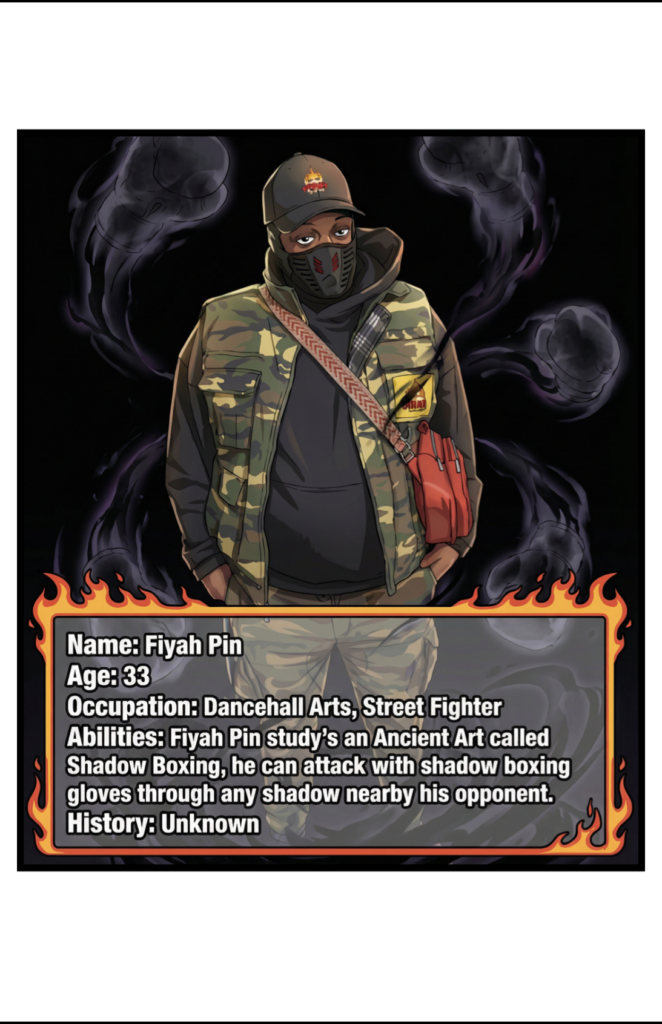 Fiyah Pin is a figure of rhythm and danger, blending the pulse of dancehall culture with the raw edge of street combat. Known for his elusive presence and unpredictable style, he moves between music and violence with equal ease. Little is known about his past, and he offers no explanations—only motion, sound, and impact. His mastery of an ancient art known as Shadow Boxing makes him both a performer and a threat lurking just beyond the light.
