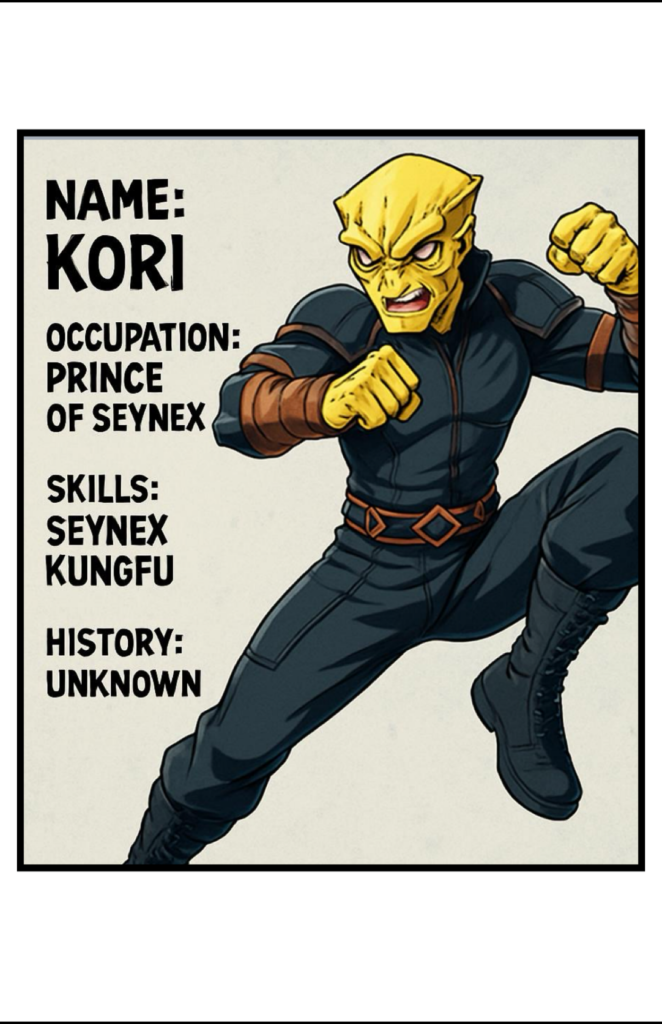 Kori is the young prince of Seynex, trained in the kingdom’s signature martial art, Seynex Kungfu. Though much of his past remains unknown, he moves with a discipline and focus that hints at both heritage and latent potential. In a world of shifting loyalties and looming conflict, Kori stands at the crossroads of tradition and responsibility, learning what it means to wield power with both skill and restraint.