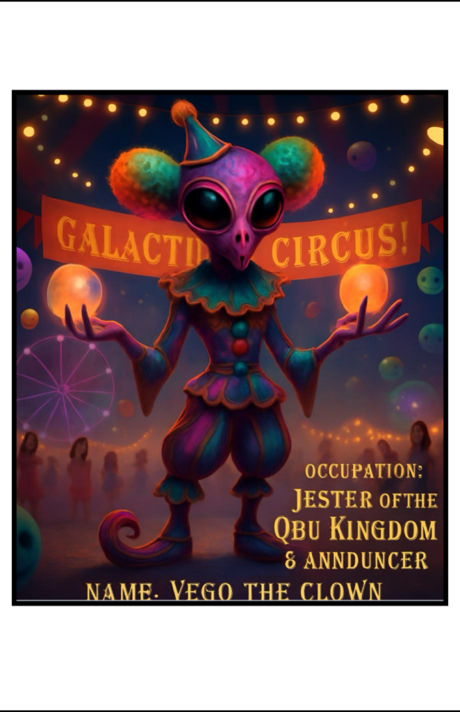 The Jester serves as both entertainer and eyes of the Qbu Kingdom within the Galactic Circus. Their announcements and performances carry weight beyond amusement, influencing opinion, morale, and political undercurrents. While many see only the laughter and spectacle, the Jester’s presence ensures the kingdom maintains insight, adaptability, and influence in every audience they engage.