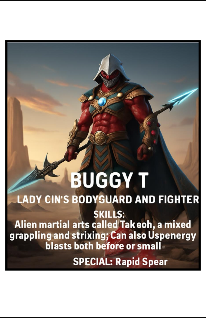 Buggy T is the steadfast protector of Lady Cin, a fighter whose loyalty and skill are as relentless as they are precise. Trained in Tak Eoh, an alien martial art blending grappling and Strixin, Buggy moves with both finesse and explosive power. With a mastery of USP energy blasts and the devastating Rapid Spear technique, Buggy ensures that threats are neutralized before they can endanger those under his watch.