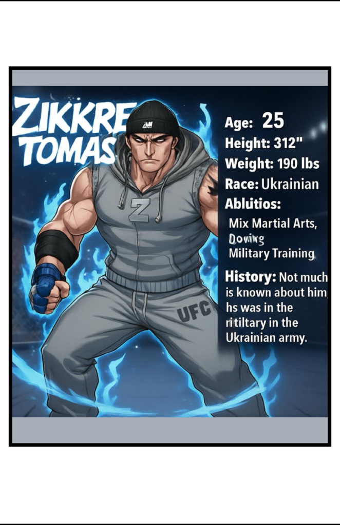 Zikkre Tomas is an imposing and enigmatic figure whose sheer stature sets him apart before he ever moves. Despite his towering height, he carries himself with controlled restraint, shaped by military discipline and combat readiness. Little is known about his personal history beyond his service in the Ukrainian Army, and Zikkre offers no insight into the man behind the training. He speaks rarely, letting silence and presence do the work.