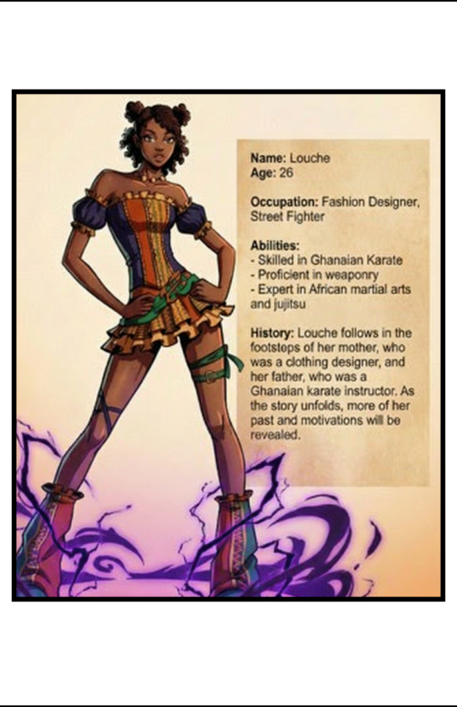 Louche moves between elegance and violence with seamless control. By day, she is a fashion designer shaped by her mother’s legacy, creating garments that carry culture, intention, and identity. By necessity, she is also a street fighter—trained, disciplined, and precise. Raised in the shadow of her father’s teachings as a Ghanaian karate instructor, Louche learned early that strength and expression are not opposites, but reflections of the same will.