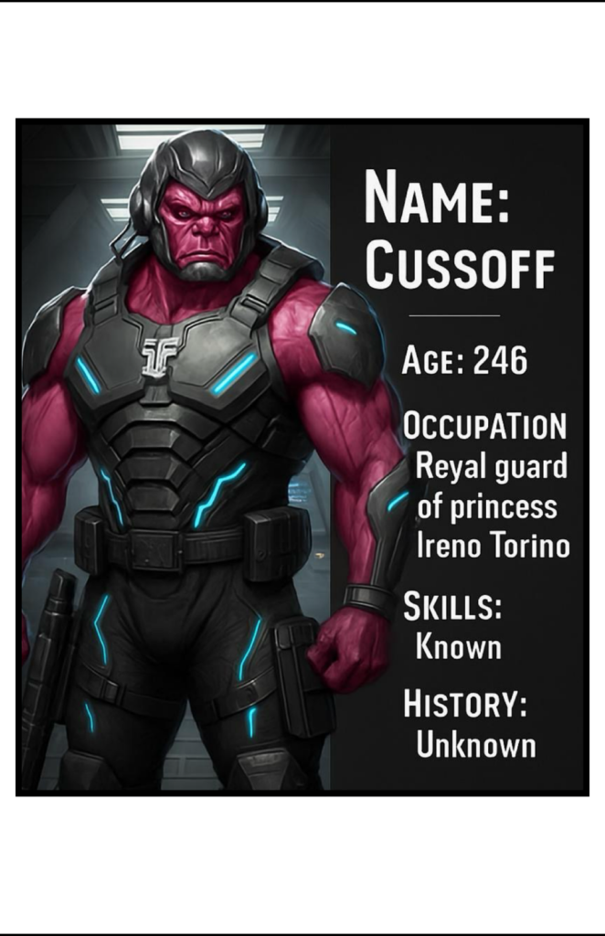 Cussoff serves as the living shield of Princess Ireno Torino. His presence alone deters threats, and his silence deepens the legend surrounding him. Whether his strength lies in skill, experience, or something far older, Cussoff remains an enduring symbol of protection—an oath made flesh, standing between the princess and all harm.