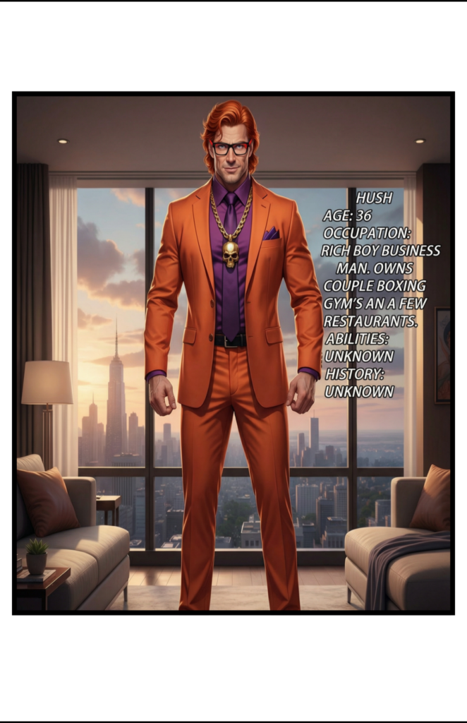 Hush is a polished and elusive figure, known publicly as a successful businessman with a growing empire of boxing gyms and restaurants. Wealth affords him access, influence, and discretion—tools he wields with careful intent. Though often dismissed as a privileged heir, those who look closer sense something calculated beneath the surface. His past remains deliberately obscured, and Hush offers no insight into how he became who he is.