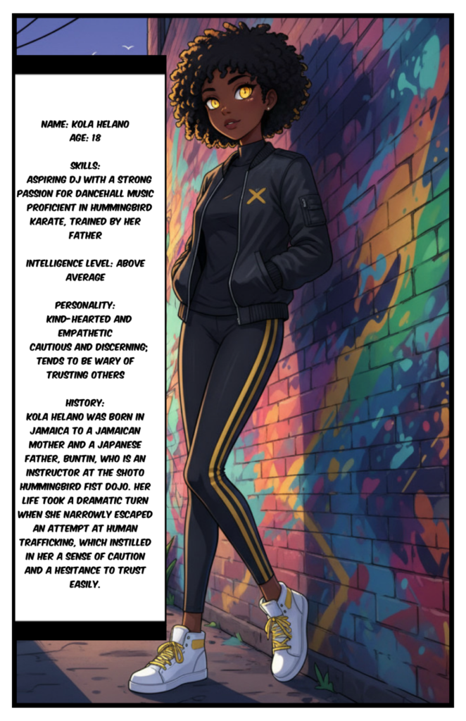 Kola Heland is a young survivor shaped by rhythm, discipline, and hard-earned caution. Born in Jamaica to a Jamaican mother and a Japanese father, Buntin—an instructor at the Shoto Hummingbird Fist Dojo—she grew up immersed in both music and martial tradition. Her life shifted permanently after narrowly escaping an attempted human trafficking incident, an experience that instilled vigilance, discernment, and a deep reluctance to trust without reason. Despite this, Kola retains a kind heart and an empathetic spirit, choosing awareness over bitterness as she moves forward.